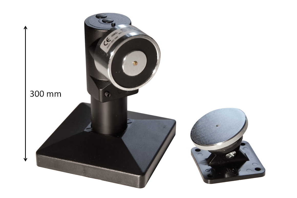 Dørmagnet med 300 mm konsol. Kan festes på vegg, gulv, eller i tak. 24Vdc. 1380/30, 100 kg, Dørmagneten drives med 24 Vdc. Strømforbruk: ca 60 mA. Holdekraft på ca 100 Kg. Sort. Fjærbelastet knapp som gir remanens beskyttelse. Mål: Magneten er festet til en konsol, for montering til vegg, gulv eller tak. Konsollen har en lengde på 300 mm. Magnet; Ø: ca 50 mm, dybde: ca 30 mm. En knapp er montert for å bryte strømmen til magneten. Anker har et ledd, som gjør at den er enkel å montere. Mål: Ø 50 mm, Monteringsplate: 60 x 60 mm, Dybde: 48 mm.