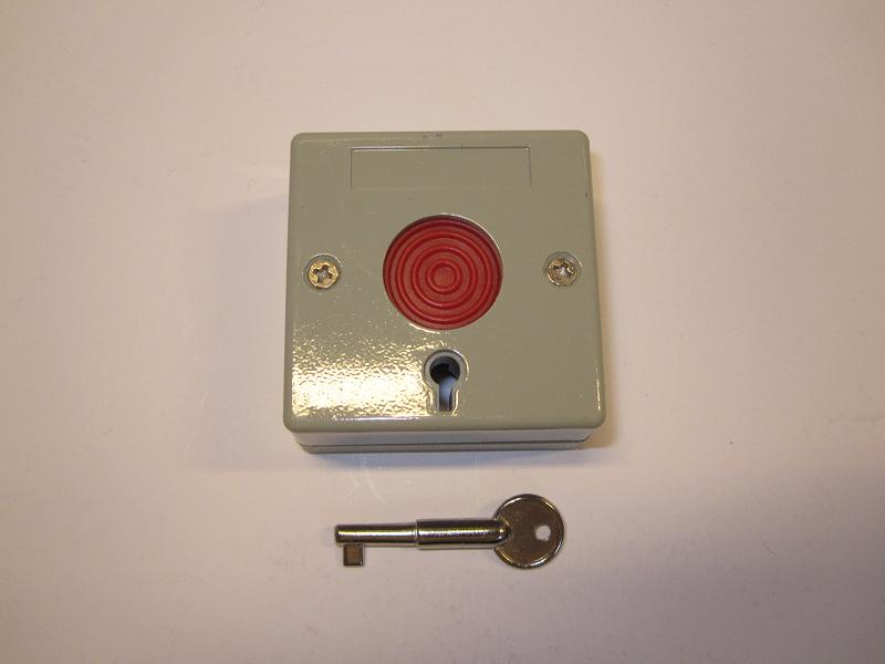En solid overfallsknapp av metall med trykknappen i midten. Metallnøkkel. Mikrobryter som tåler hele 5 amp. med vekslings-kontakt og solide terminaler. Reset funksjonen kan låses ved montering, så knappen blir fjærende i retur etter trykk. Mål: 55 x 55 mm og dybde 27 mm.