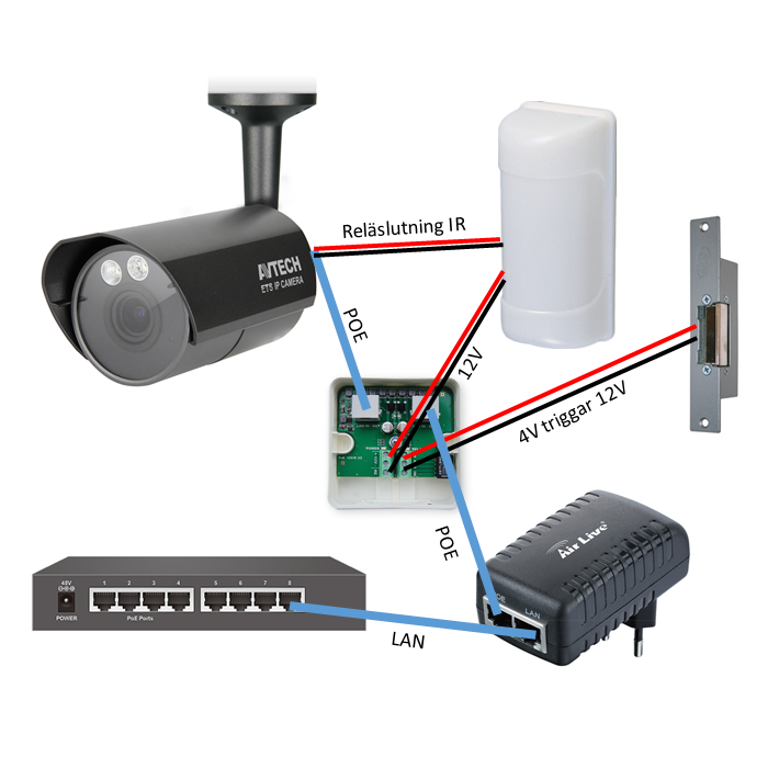 Reläkortet PV48/12 har många funktioner men är först och främst framtagen för att strömförsörja våra push video kameror med POE och samtidigt strömförsörja en IR-detektor eller liknande med 12V. Med PV48/12 slipper du dra egna strömförsörjningar till dina externa larmgivare, allt går genom 1 nätverkskabel. Då våra kameror har en 4V utgång som kan styras från appen har vi också lagt till ett 4V triggat 12V relä som gör det möjligt att styra 12V laster direkt ifrån din kamera, allt för att du ska slippa dra massa kabel. Kortet är kapslat i en IP-66 kapsling.
