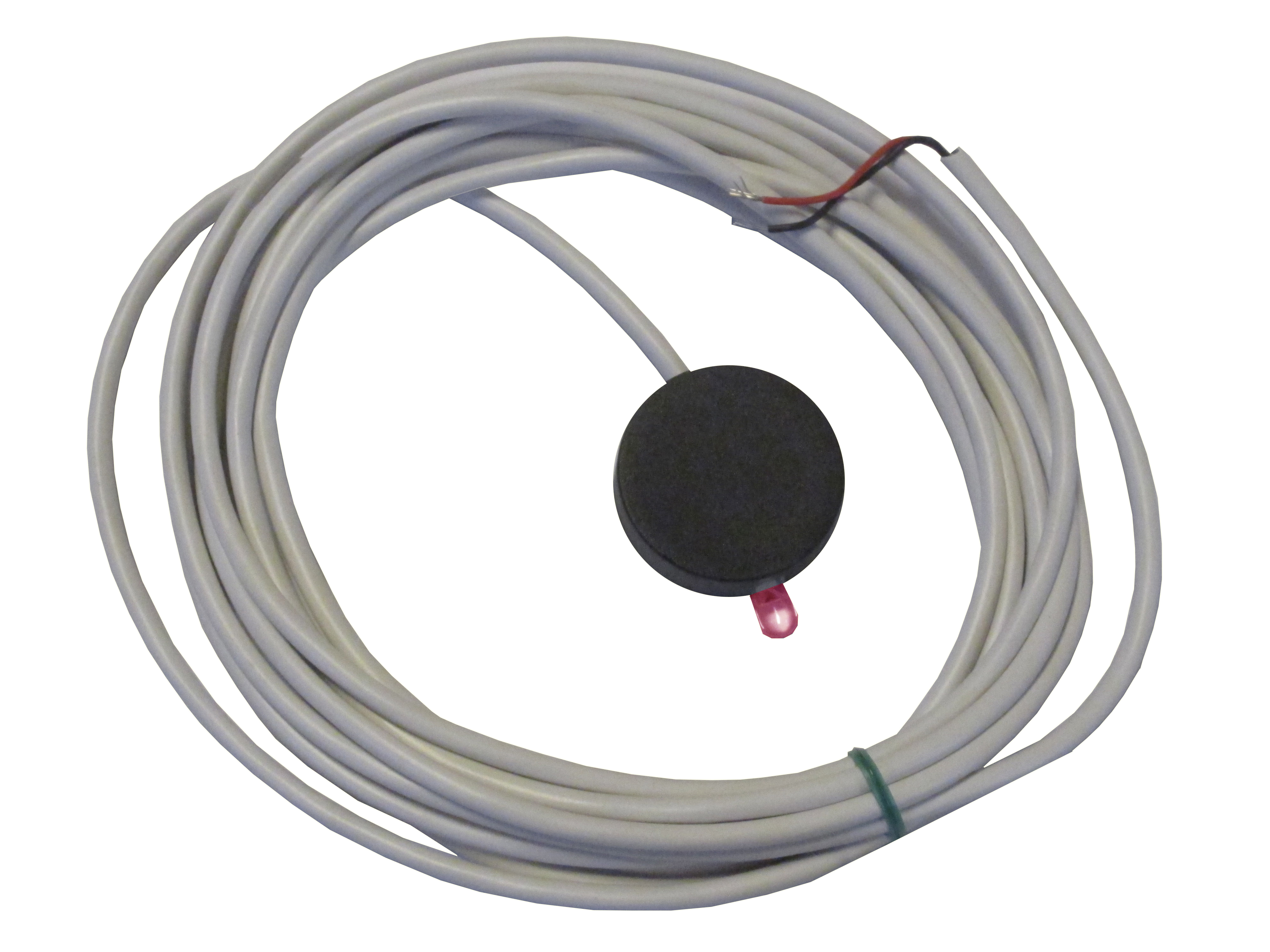 Liten Rød LED montert i en rund boks med 3 meter kabel. For montering på innsiden av vinduet med tosidig tape. Rød LED, GSM TR4E. Mål: Ø: 30 mm, dybde: 11 mm.